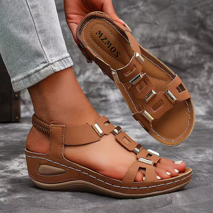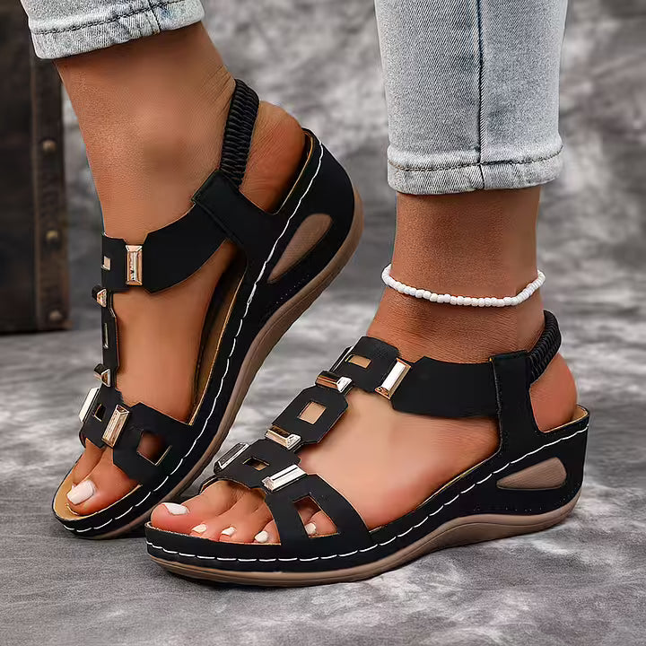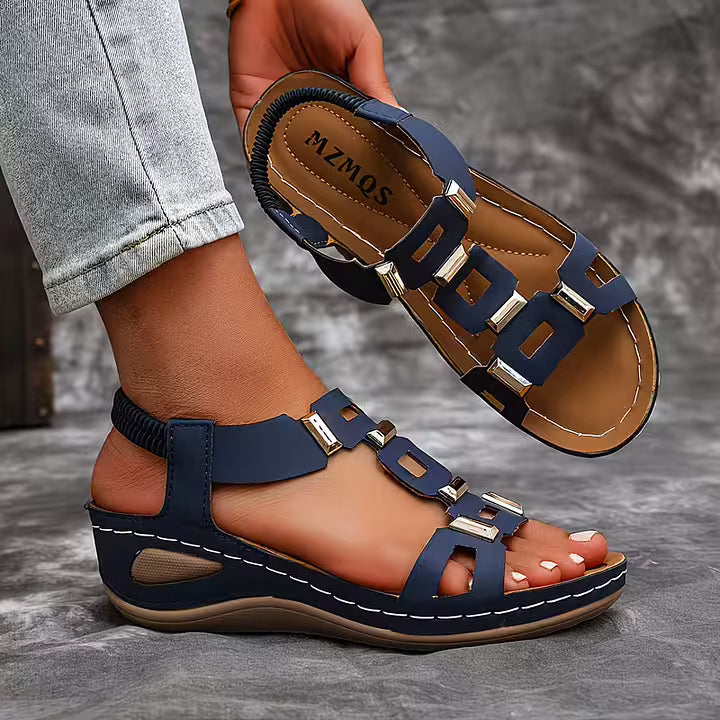 These open toe sandals feature a structured multi-strap upper accented with metallic details for a bold finish. The slingback construction and supportive sole create a balanced silhouette suited for daily wear, travel, and warm-weather styling.