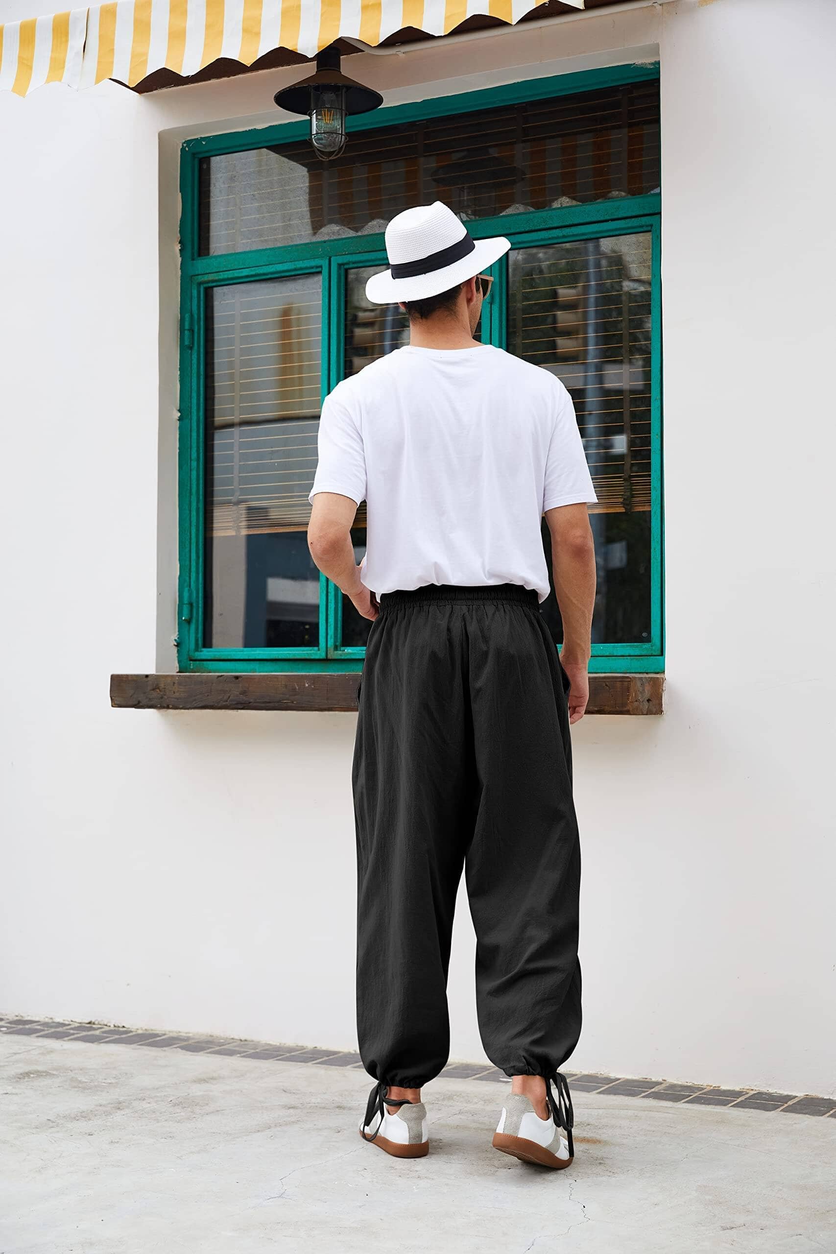 • STYLISH DESIGN: Casual harem pants, designed in drawstring elastic waistband, drawstring knotted bottom of trouser, 2 side pockets, solid color and loose fit style.