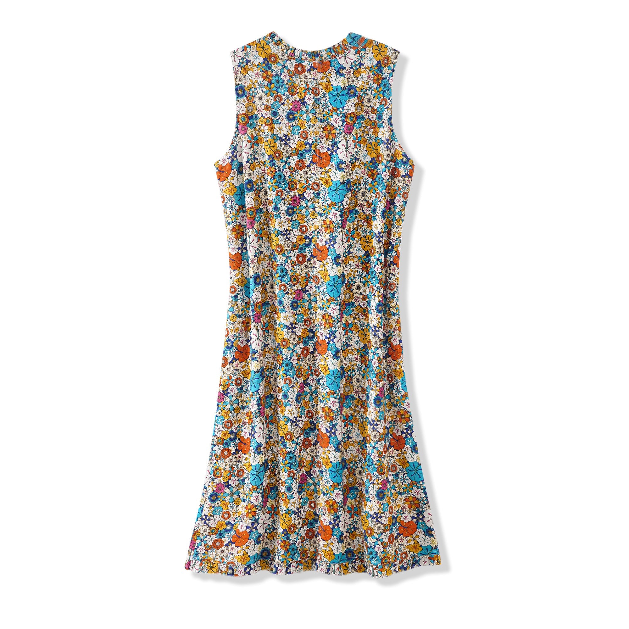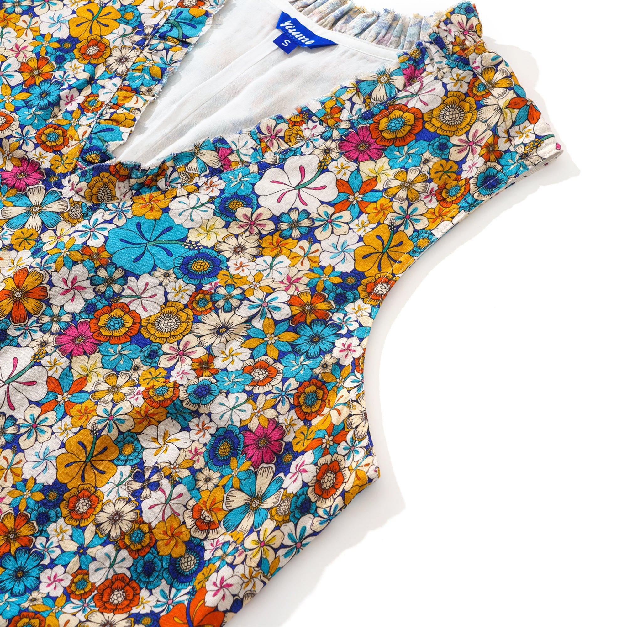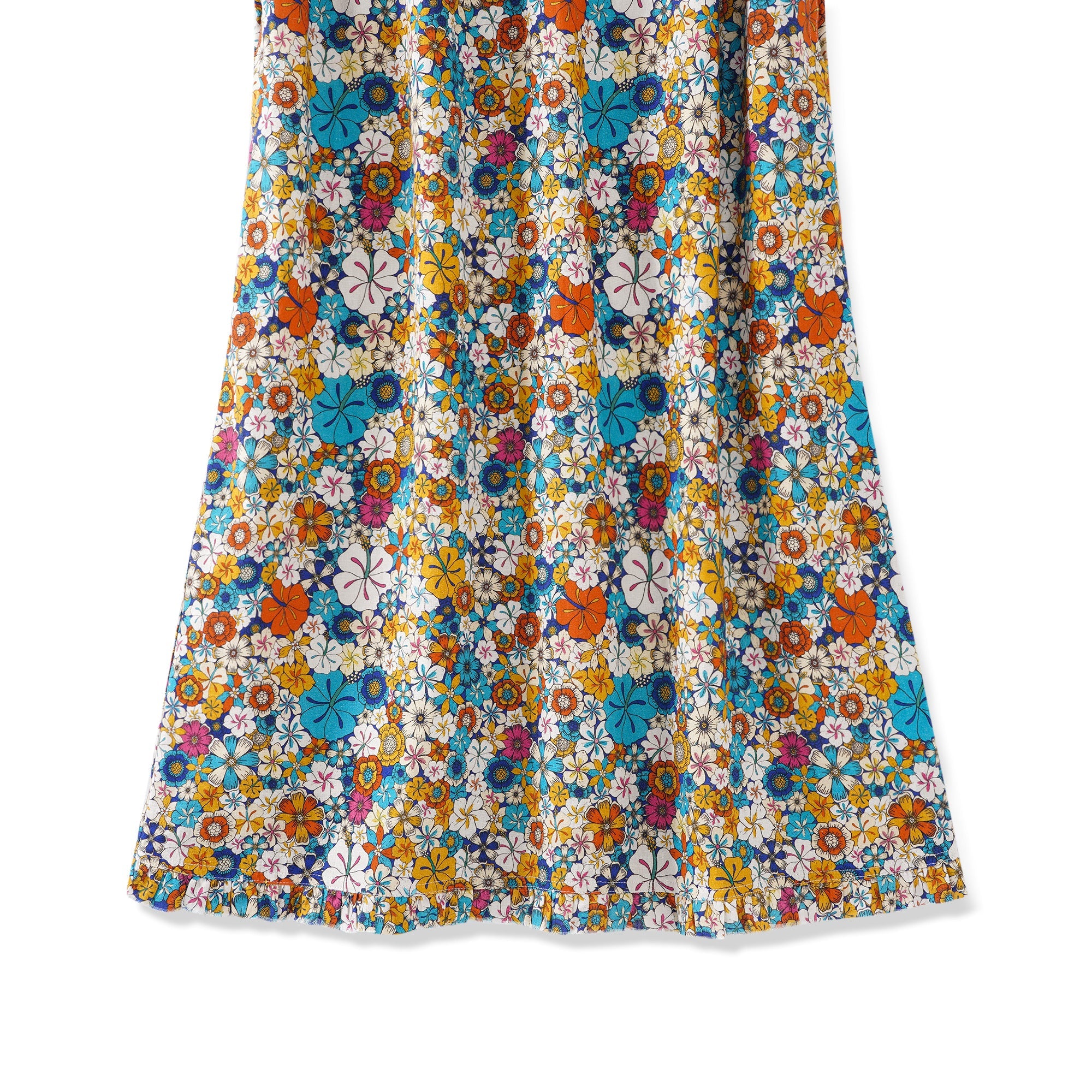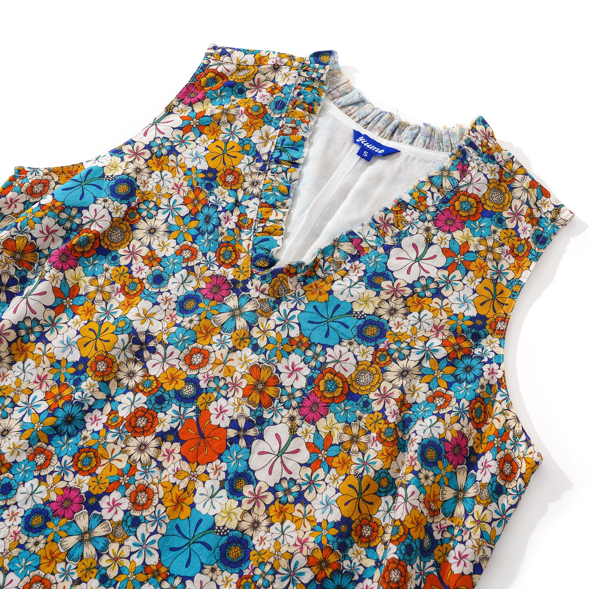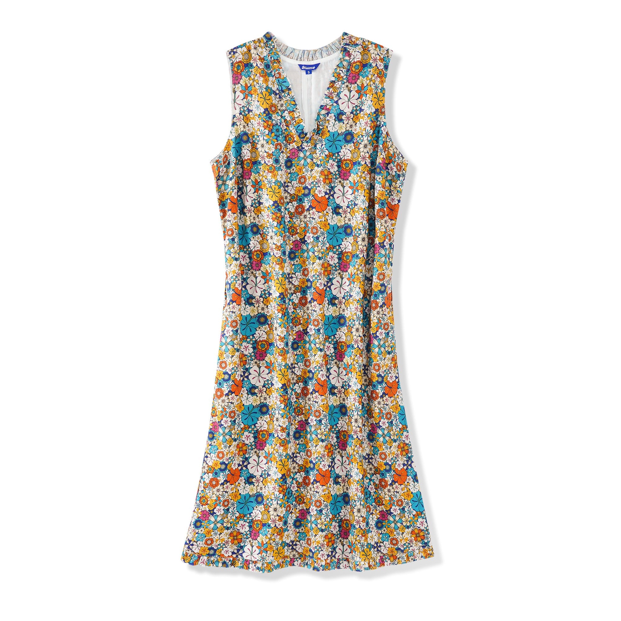 55% Linen / 45% RayonClassic fit: A loose-fitting, knee-length A-line skirt with a slimming V-neck V-neck With a pocket on each side of the waistThe lining is made of 100% rayon, offering a great drape without sticking.The neckline and hem are adorned with ruffle trimTiny snaps are on each shoulder inside to hold your bra straps if you want toUnique hand-painted print It is recommended to hand wash in warm water below 37 degrees Celsius and air dry, or tumble dry at a low temperature